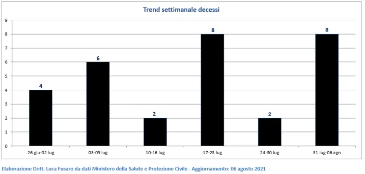 Nel bollettino del 5 agosto “la Regione Calabria informa che tra i decessi comunicati in data odierna n. 3 sono avvenuti in date precedenti: 17/07/2021, 18/07/2021 e 04/08/2021”, di conseguenza nel dato settimanale non sono conteggiati quelli relativi a luglio. Il numero dei decessi sale da 2 a 8. Nelle ultime 3 settimane i decessi sono stati 18, nel periodo 26 giugno-16 luglio furono 12 (+50%).