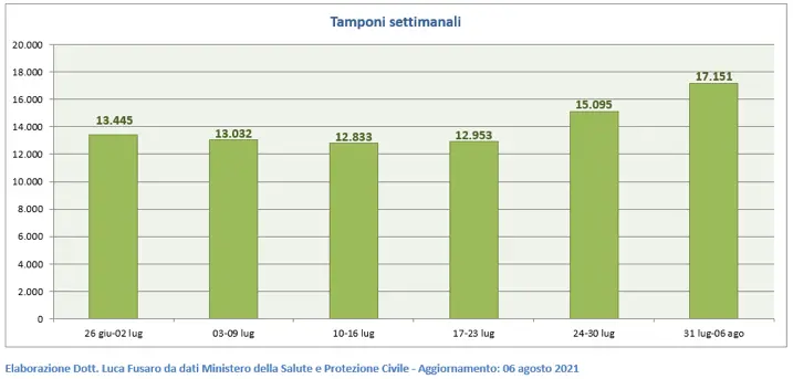 Il numero dei tamponi settimanali cresce da 15.095 a 17.151(+13,6%), in media 2.450 al giorno.