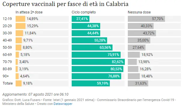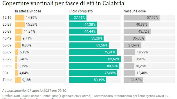Al 7 agosto (aggiornamento ore 06:10), il 9,18% della popolazioneover 12 è in attesa della 2ᵃ dose (n. 155.062), il 59,19% ha completato il ciclo vaccinale (n. 999.494), il 31,63% non ha ricevuto alcuna dose (n. 534.061), il 68,37%ha ricevuto almeno una dose di vaccino (n. 1.154.556).