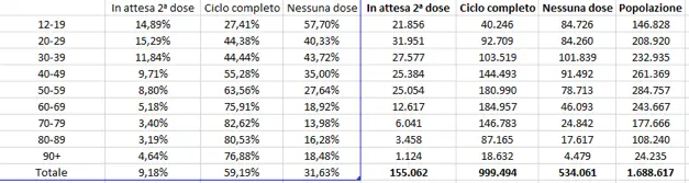 Nota metodologica: nel calcolo delle percentuali dei vaccinati utilizzo come dato non l’intera popolazione regionale ma la platea interessata ossia i soggetti ≥ 12 anni che secondo la stima dell’Istat sulla popolazione residente al 1° gennaio 2021 è pari a 1.688.617.