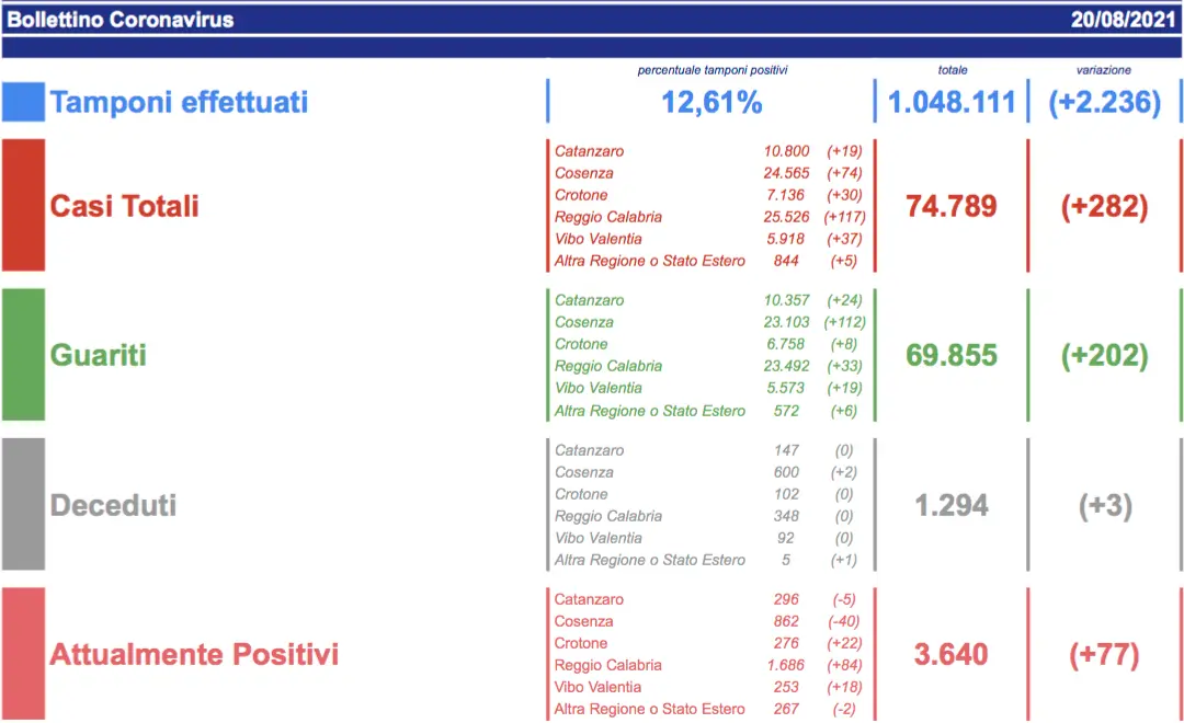 - Reggio Calabria: CASI ATTIVI 1.686 (58 in reparto, 2 in terapia intensiva, 1.626 in isolamento domiciliare); CASI CHIUSI 23.840 (23.492 guariti, 348 deceduti);