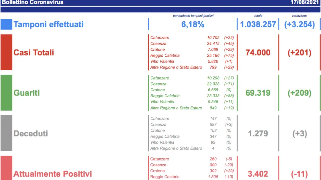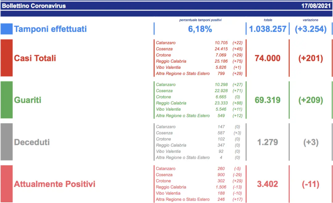 - Reggio Calabria: CASI ATTIVI 1.506 (40 in reparto, 3 in terapia intensiva, 1.463 in isolamento domiciliare); CASI CHIUSI 23.680 (23.333 guariti, 347 deceduti);