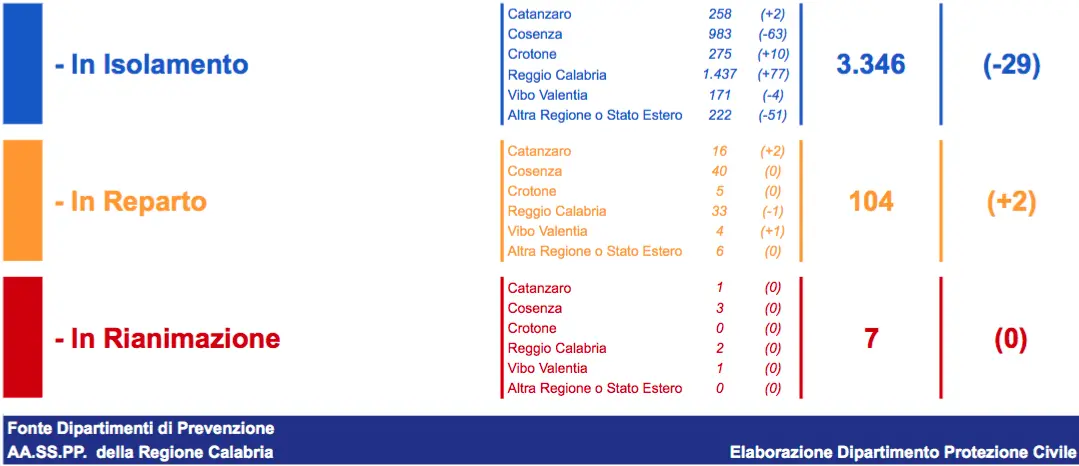 - Reggio Calabria: CASI ATTIVI 1.472 (33 in reparto, 2 in terapia intensiva, 1.437 in isolamento domiciliare); CASI CHIUSI 23.455 (23.108 guariti, 347 deceduti);