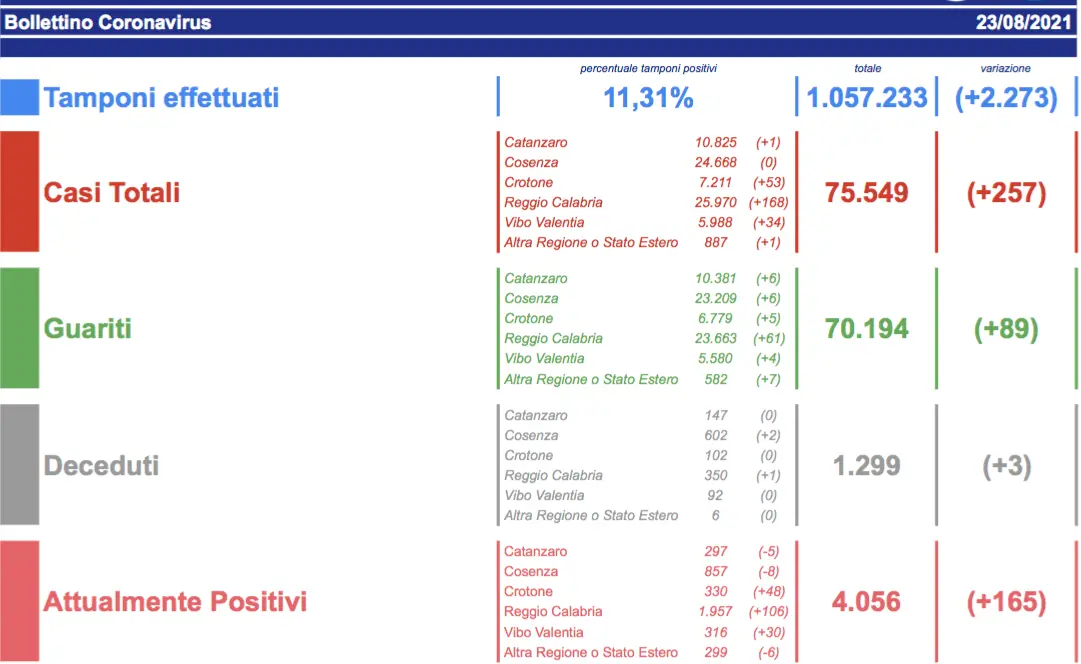 - Reggio Calabria: CASI ATTIVI 1.957 (54 in reparto, 2 in terapia intensiva, 1.901 in isolamento domiciliare); CASI CHIUSI 24.013 (23.663 guariti, 350 deceduti).