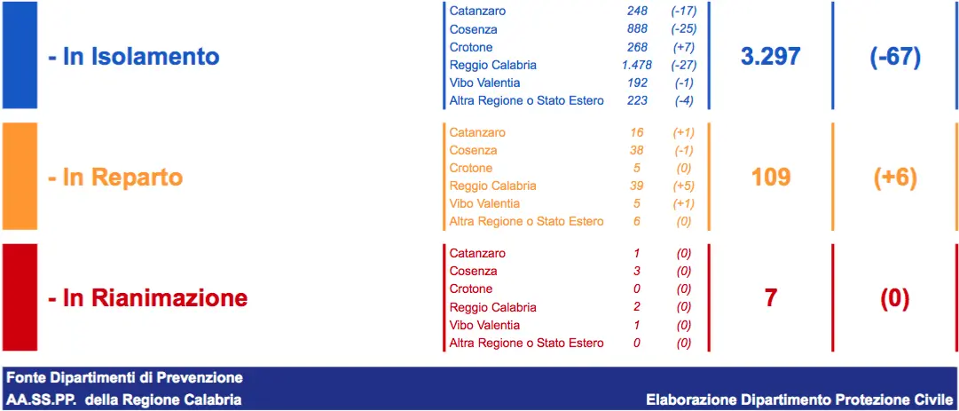 - Reggio Calabria: CASI ATTIVI 1.519 (39 in reparto, 2 in terapia intensiva, 1.478 in isolamento domiciliare); CASI CHIUSI 23.592 (23.245 guariti, 347 deceduti);