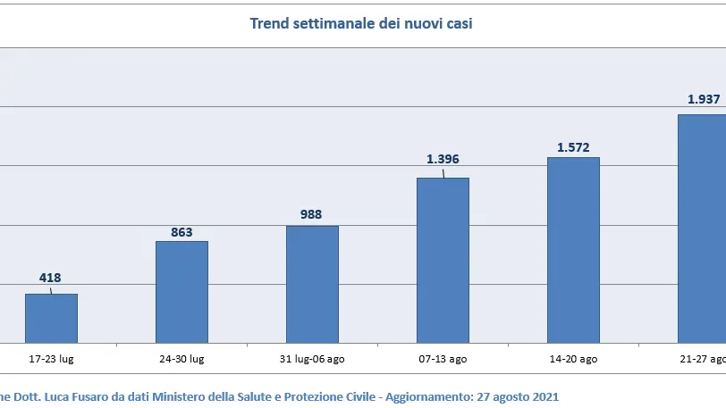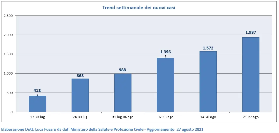 - nuovi casi settimanali: da 1.572a 1.937 (+23,2%);