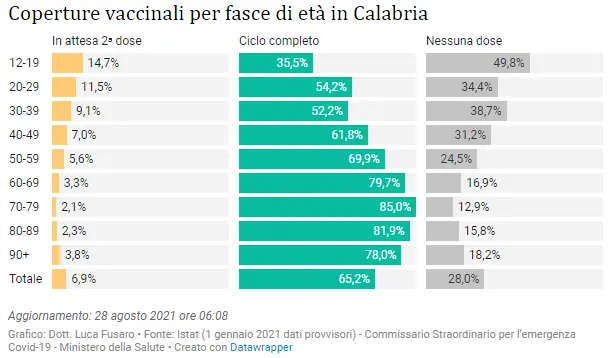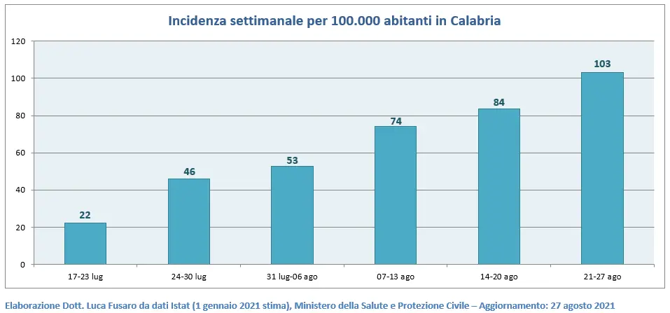 Monitoraggio settimanale dell’epidemia da Covid-19 in Calabria a cura di Luca Fusaro: dati aggiornati al 27 agosto 2021 ore 17:00 (dati monitoraggio epidemia) e al 28 agosto 2021 ore 06:08 (dati vaccini).