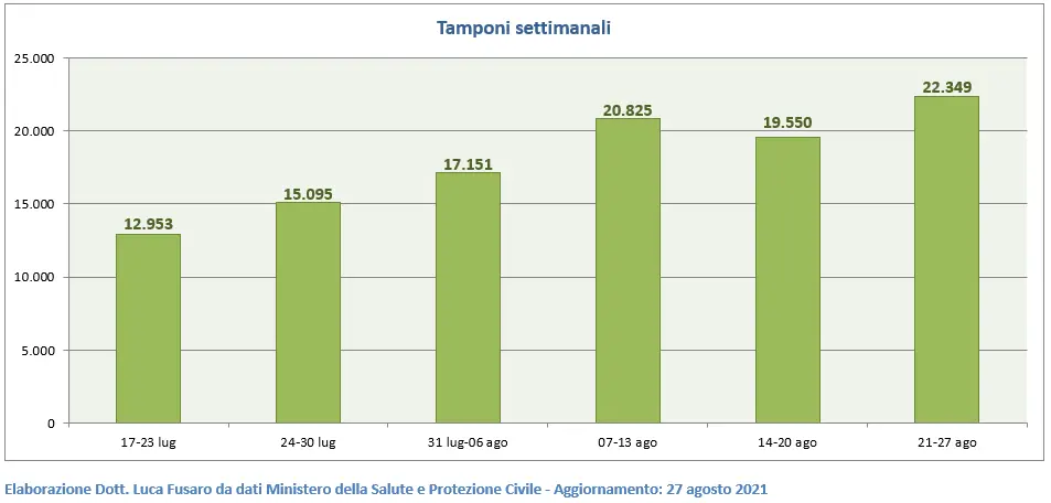 Il numero dei tamponi settimanali cresce da 19.550 a 22.349(+14,3%), in media 3.193 al giorno.