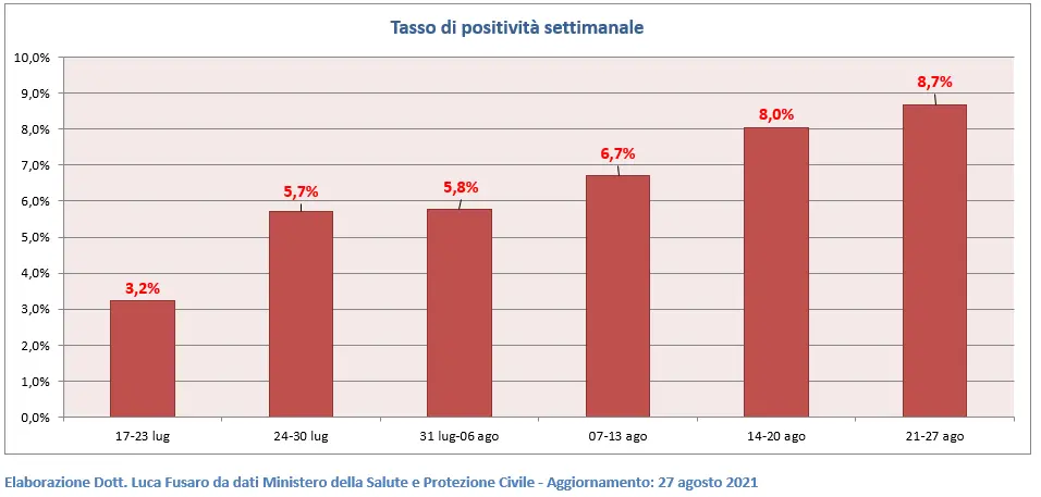 Il tasso di positività,calcolato sui tamponi, passa da 8% a 8,7%.