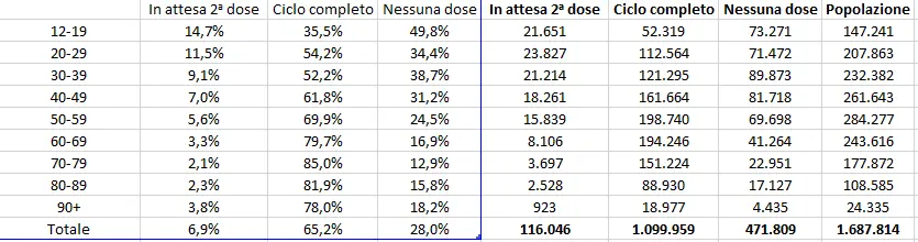 Nota metodologica: nel calcolo delle percentuali dei vaccinati utilizzo come dato non l’intera popolazione regionale ma la platea interessata ossia i soggetti ≥ 12 anni che secondo i dati provvisori dell’Istat sulla popolazione residente al 1° gennaio 2021 è pari a 1.687.814.