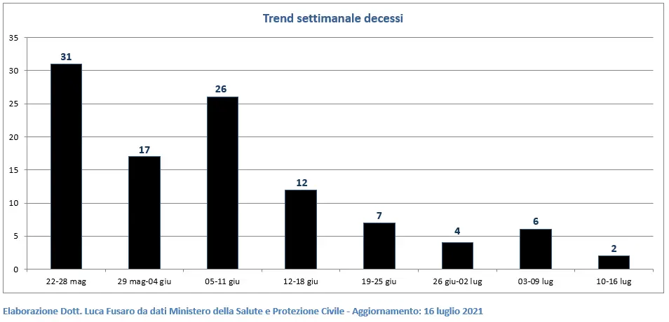Il numero dei decessi scende a 2 (-66,7%). Nelle ultime 4 settimane i decessi sono stati 19 contro gli 86 del periodo 22 maggio-18 giugno (-77,9%).
