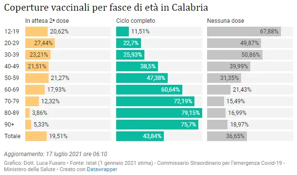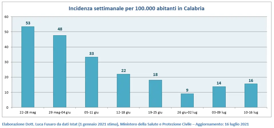 Monitoraggio settimanale dell’epidemia da Covid-19 in Calabria a cura del Dott. Luca Fusaro: dati aggiornati al16 luglio 2021 ore 17:00 (dati monitoraggio epidemia) e al17 luglio 2021 ore 06:10 (dati vaccini).