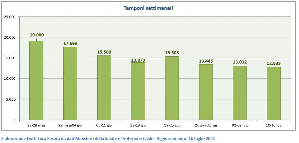Il numero dei tamponi settimanali passa da 13.032 a 12.833(-1,5%), in media 1.833 al giorno.