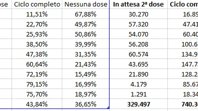 Gli over 60 che non hanno ricevuto nemmeno una dose di vaccino risultano 102.728su 553.808 (18,55%), 451.080hanno ricevuto almeno una dose (81,45%), 380.025hanno completato il ciclo vaccinale (68,62%), 71.055sono in attesa della 2ᵃ dose (12,83%).