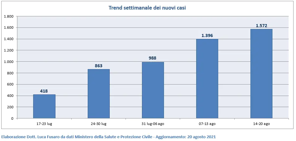 - nuovi casi settimanali: da 1.396a 1.572 (+12,6%);