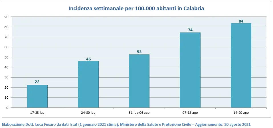 Ecco il monitoraggio settimanale dell’epidemia da Covid-19 in Calabria a cura di Luca Fusaro: i dati sono aggiornati al 20 agosto 2021 ore 17:00 (dati monitoraggio epidemia) e al 21 agosto 2021 ore 06:11 (dati vaccini).