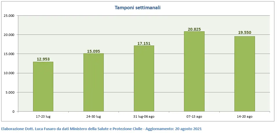 Il numero dei tamponi settimanali cresce da 20.825 a 19.550(-6,1%), in media 2.793 al giorno.