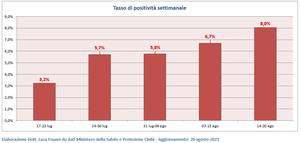 Il tasso di positività,calcolato sui tamponi, passa da 6,7% a 8%.