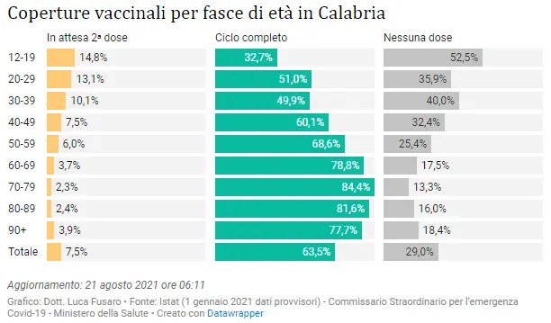 Al 21 agosto (aggiornamento ore 06:11), il 7,5% della popolazioneover 12 è in attesa della 2ᵃ dose (n. 125.942), il 63,5% ha completato il ciclo vaccinale (n. 1.071.938), il 29% non ha ricevuto alcuna dose (n. 489.934), il 71%ha ricevuto almeno una dose di vaccino (n. 1.197.880).