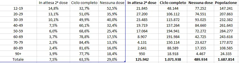 Nota metodologica: nel calcolo delle percentuali dei vaccinati utilizzo come dato non l’intera popolazione regionale ma la platea interessata ossia i soggetti ≥ 12 anni che secondo i dati provvisori dell’Istat sulla popolazione residente al 1° gennaio 2021 è pari a 1.687.814.