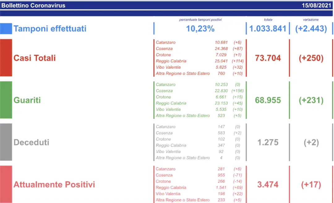 - Reggio Calabria: CASI ATTIVI 1.541 (34 in reparto, 2 in terapia intensiva, 1505 in isolamento domiciliare); CASI CHIUSI 23.500 (23.153 guariti, 347 deceduti);