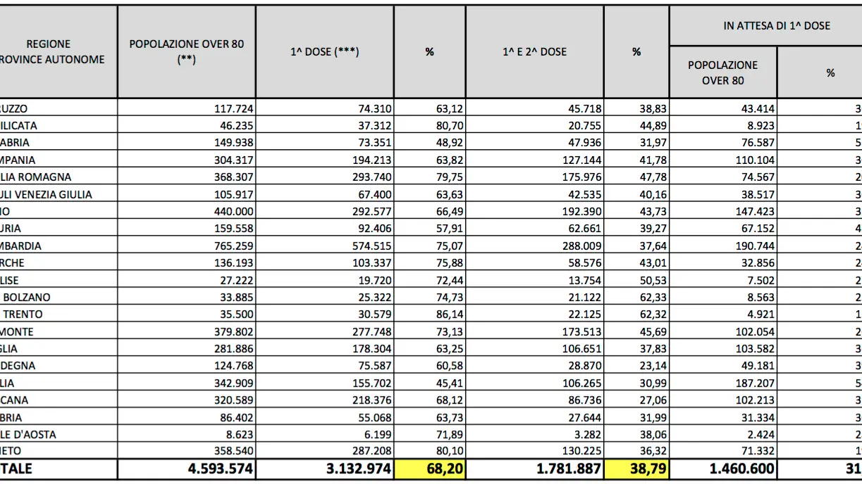 In Calabria, infatti, registriamo che su 149.938 soggetti “Over 80”, hanno ricevuto la prima dose 73.351 persone (48,92 per cento), le due dosi 47.936 persone (31,97 per cento), ma 76.587 persone attendono la prima dose (51,08 per cento).