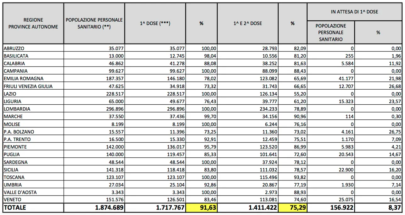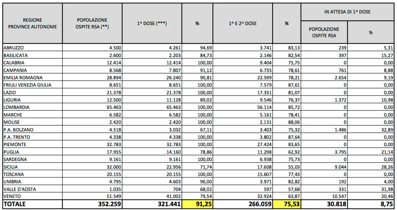 L’unica categoria messa quasi al sicuro è quella degli ospiti delle Rsa. In questo caso su 12.414 che vengono curati nelle case per anziani, 12.414 hanno ricevuto la prima dose (100 per cento) e 9.404 hanno avuto le due dosi (75m75 per cento). Mancano dunque 3.010 somministrazioni per completare tutta la fascia “ospiti Rsa”.