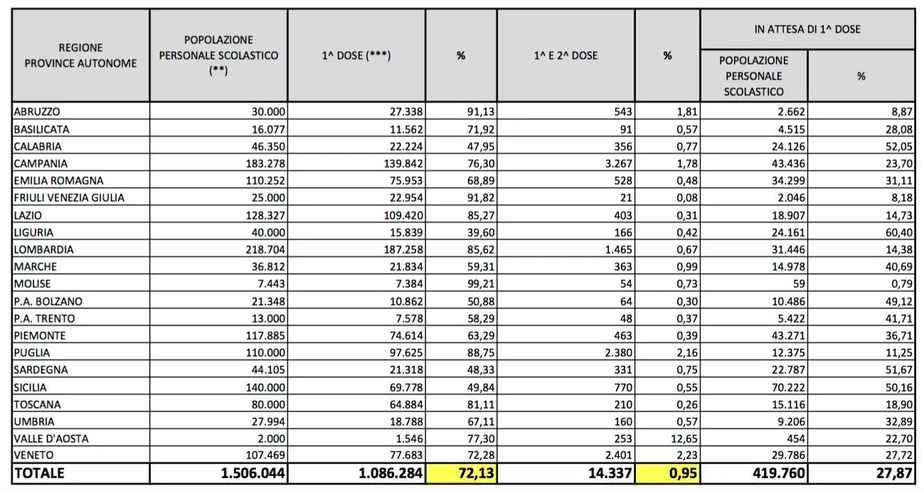 Infine, l’altra nota dolente calabrese. La tabella 5 infatti parla della categoria “personale scolastico”. E sono dolori. Su 46.530 soggetti che lavorano negli istituti statali e paritari, solo 22.224 hanno ricevuto la prima dose (47,95 per cento), ma di questi 356 hanno completamente la fase vaccinale (0,77 per cento). Attendono la prima dose 24.126 persone pari al 52,05 per cento del totale. I dati del Governo sono aggiornati alla data del 10 aprile 2021.