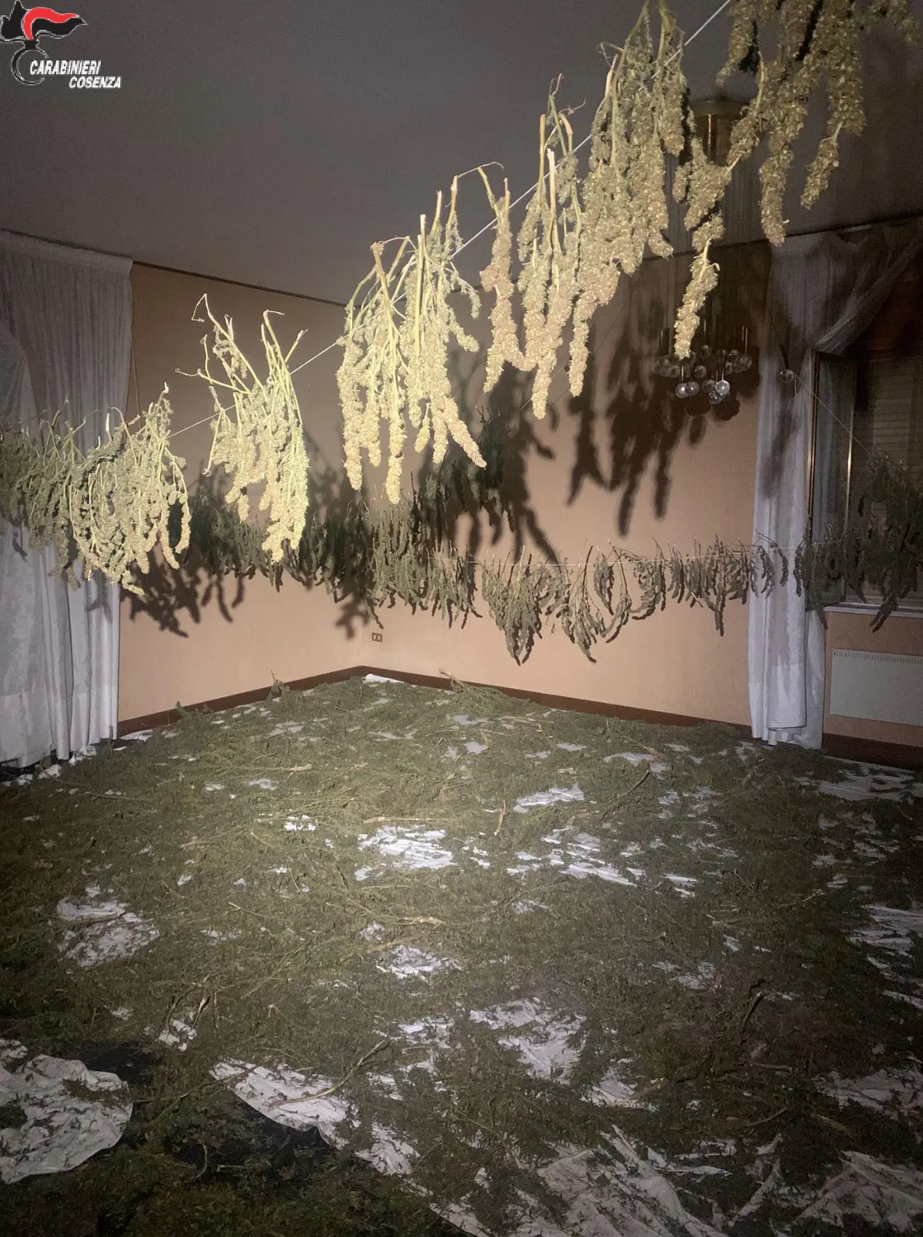In diversi locali vi erano dei fili in ferro tesi a cui erano appesi ramoscelli di canapa indica in fase di essicazione, mentre in altri la sostanza era raccolta dentro delle lenzuola, pronta per la divisione in dosi. In alcune stanze, vi erano poi, delle inflorescenze di marijuana chiuse in dei sacchi in plastica, pronte per essere smerciate ai pusher del luogo. I militari della Sezione Operativa focalizzavano la loro attenzione sul repertamento di tracce biologiche lasciate dai possibili responsabili del laboratorio di marijuana. In effetti venivano ritrovati dei mozziconi di sigaretta, dei bicchieri e delle bottiglie in plastica utilizzate recentemente. Tutta la sostanza stupefacente veniva sottoposta a sequestro penale, in attesa degli esami tecnici e della successiva distruzione, nonché delle ulteriori indagini in corso per individuare i responsabili.