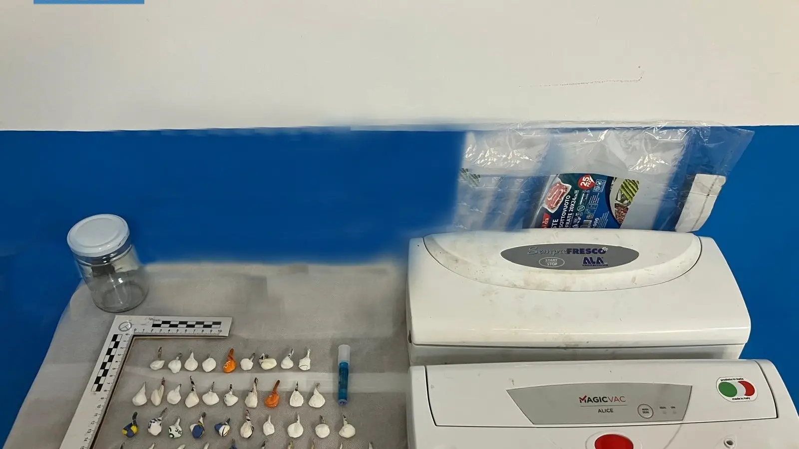 Gli Agenti rinvenivano, occultati all’interno dell’abitazione, sostanza stupefacente del tipo cocaina, in parte già suddivisa in dosi, per un peso di 50 grammi, nonché numeroso materiale utile alla pesatura e due macchine per il confezionamento sottovuoto.