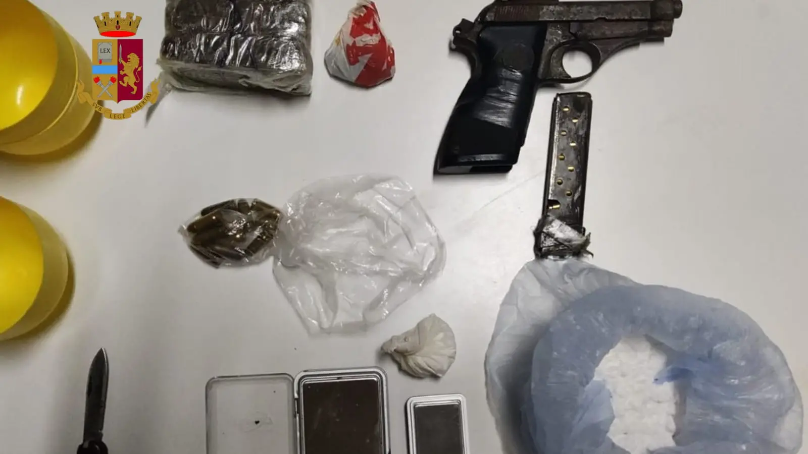 Inoltre, all’interno dell’appartamento è stata rinvenuta anche una pistola marca Beretta calibro 7.65 con matricola abrasa e relativo caricatore inserito, rifornito di 10 cartucce, nonché ulteriori 11 cartucce calibro 7.65 sfuse. Il soggetto tratto in arresto, come disposto dal P.M. di turno presso la Procura della Repubblica di Castrovillari, è stato tradotto presso la locale Casa Circondariale.