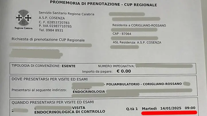 Accade che “semplice” visita endocrinologa di controllo – dunque nell’ambito della tanto sbandierata prevenzione – sia fissata tramite il cup regionale “solo” il 14 gennaio 2025.