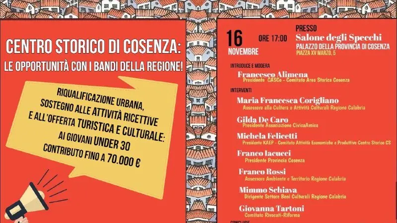 I comitati CASCo – Comitato Area Storica Cosenza, Rivocati/ Riforma, KAEP Komitato Attività economiche e produttive centro storico e l’Associazione Civica Amica, che ormai da tempo operano nella realtà del centro storico di Cosenza, presentano l’incontro “Centro storico di Cosenza: le opportunità con i bandi della Regione”, che si terrà venerdì 16 novembre alle ore 17 presso la Sala degli Specchi del Palazzo della Provincia di Cosenza.