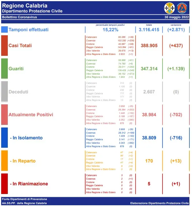 – Vibo Valentia: casi attivi 3.352 (9 in reparto, 0 in terapia intensiva, 3.343 in isolamento domiciliare); casi chiusi 36.323 (36.152 guariti, 171 deceduti).