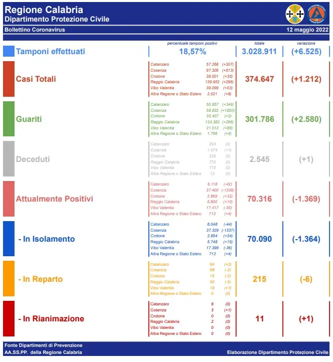 – Vibo Valentia: casi attivi 17.417 (18 in reparto, 0 in terapia intensiva, 17.399 in isolamento domiciliare); casi chiusi 21.682 (21.512 guariti, 170 deceduti).