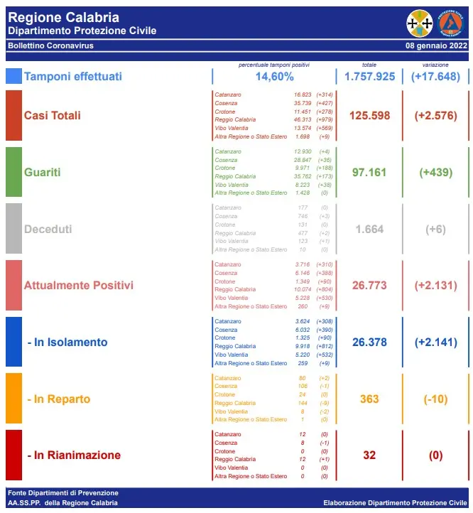 – Reggio Calabria: casi attivi 10.074 (144 in reparto, 12 in terapia intensiva, 9.918 in isolamento domiciliare); casi chiusi 36.239 (35.762 guariti, 477 deceduti).