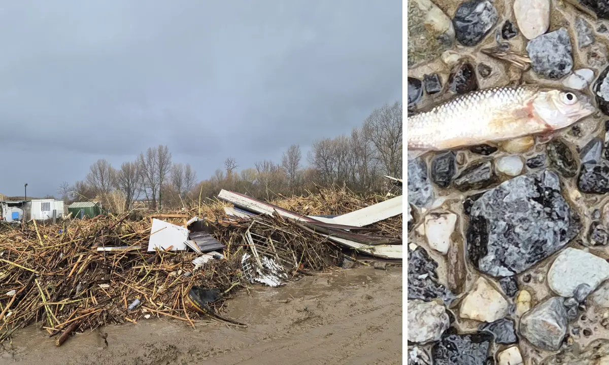 A Castiglione Cosentino, in via Ponte Crati, I pesci sono arrivati nel cantiere alluvionato dal Crati