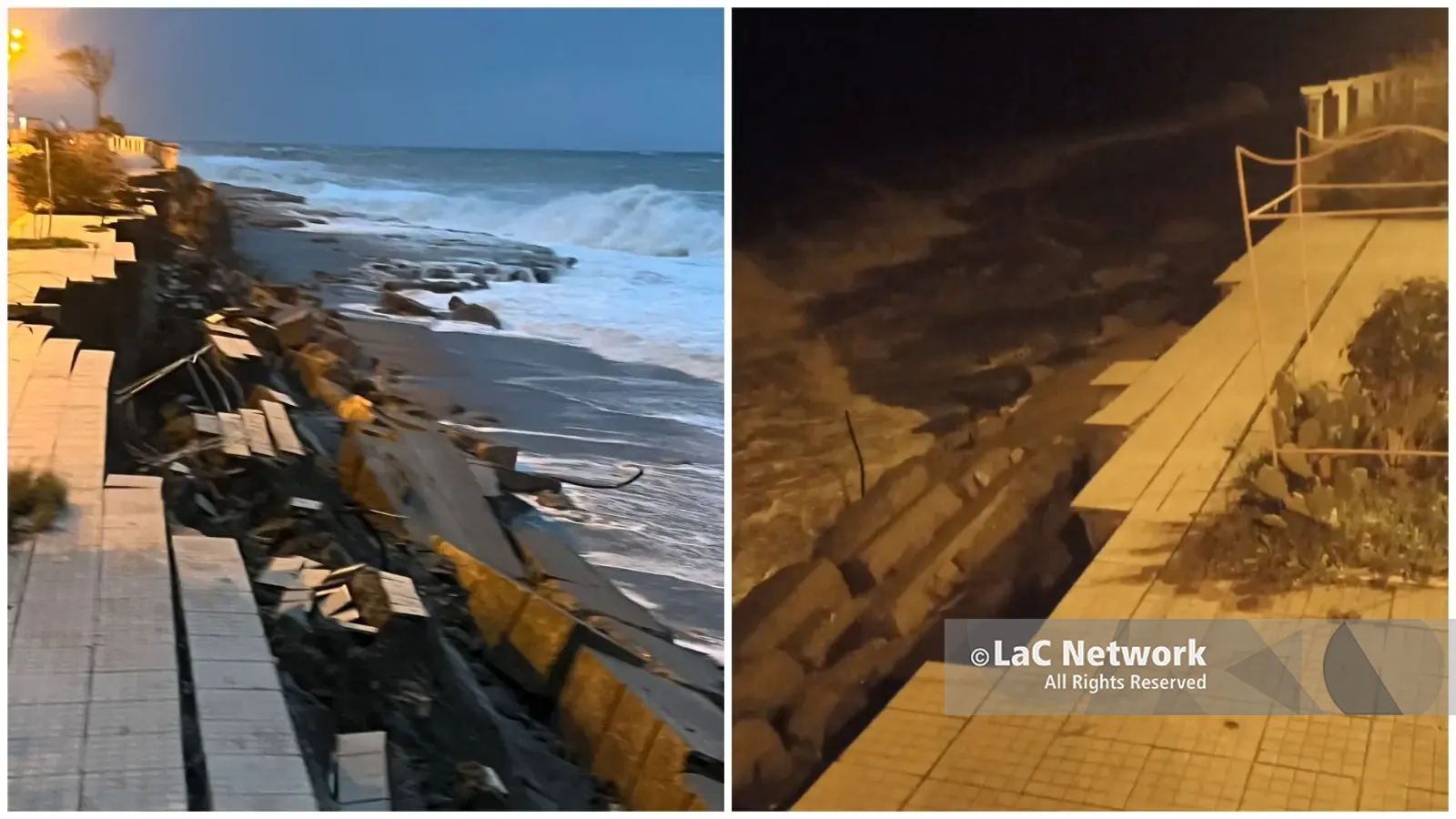 La notte segna il primo impatto concreto dell’emergenza maltempo sulla fascia jonica reggina. A Melito Porto Salvo la mareggiata ha divorato circa cento metri di lungomare, trascinando via parte del marciapiede pedonale e del parapetto affacciato sul mare.