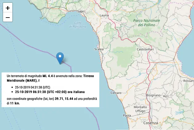 I primi rilievi, a circa 15′ dalla scossa, hanno permesso all’Istituto Nazionale di Geofisica e Vulcanologia di essere più precisi. Il terremoto è avvenuto nelle acque del mar Tirreno, dinanzi alla costa compresa tra i comuni di Sclaea e Cetraro. La magnitudo sprigionata è stata di 4.4.