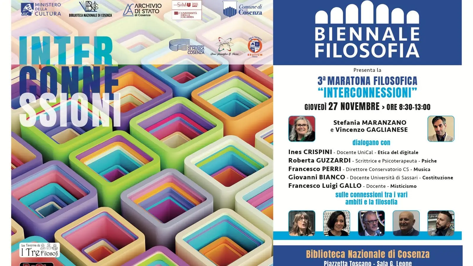 Cosenza si sveglia spesso con la testa china sul traffico, sulle scadenze dei giorni feriali, sulle mattine che iniziano troppo presto e finiscono troppo tardi. Ma ci sono momenti — rari, preziosi, quasi anacronistici — in cui la città alza gli occhi. In cui la cultura non è più un manifesto da appendere, un evento da registrare su un’agenda distratta, ma diventa uno spazio reale, condiviso, dove le persone si incontrano non per celebrare qualcosa, ma per capire qualcosa. Giovedì 27 novembre, dalle 9:00 alle 13:00, nella Sala Giorgio Leone della Biblioteca nazionale di Piazza Toscano, accadrà di nuovo. Accadrà con la terza Maratona Filosofica della Biennale Filosofia, intitolata “Interconnessioni”: una parola che, detta così, sembra un tecnicismo, ma che invece restituisce la trama invisibile che unisce la filosofia alla vita quotidiana, il pensiero ai gesti, le idee ai corpi che attraversano le nostre strade.