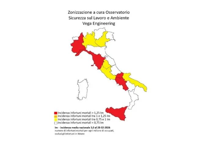 L’analisi dell’Osservatorio si sofferma anche sulle fasce d’età più esposte. A febbraio 2026 l’incidenza più elevata si registra tra gli over 65, con 12,7 decessi per milione di occupati. Seguono i lavoratori tra 15 e 24 anni, con un’incidenza di 5,7, e quelli tra 55 e 64 anni, con 4,6. In termini assoluti, però, è proprio la fascia tra 55 e 64 anni a risultare la più colpita, con 26 vittime su un totale di 72 decessi in occasione di lavoro.