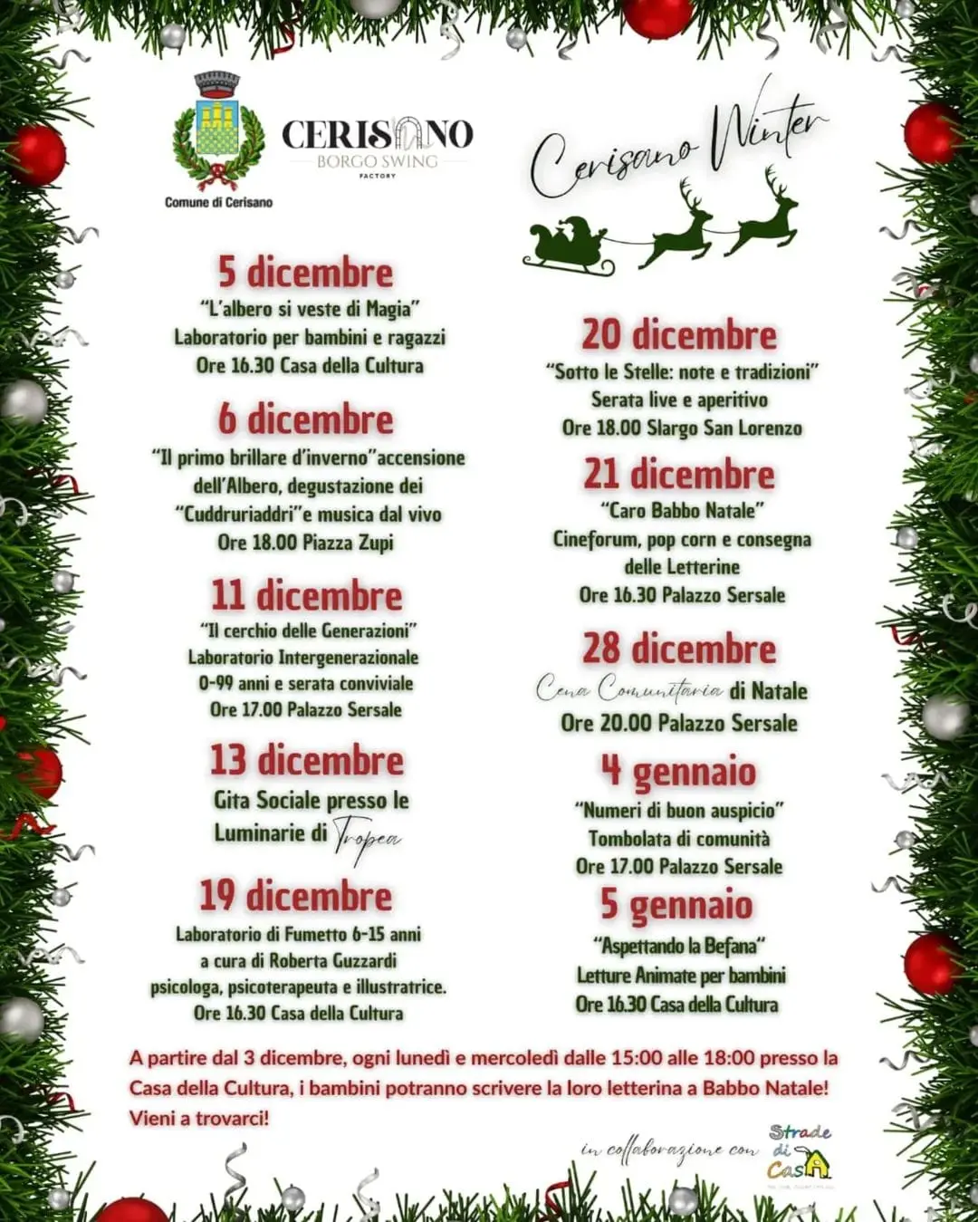 Cerisano accende l’inverno con un programma capace di restituire al borgo l’atmosfera calda e coinvolgente delle feste. Il progetto Cerisano Winter, parola chiave del cartellone, raccoglie attività pensate per tutte le età e costruite intorno all’idea di una comunità che si incontra, crea, partecipa e riscopre insieme tradizione e innovazione. La Casa della Cultura e Palazzo Sersale diventano i luoghi simbolo di questo percorso, accompagnando famiglie, bambini e cittadini lungo tutto l’arco delle festività.