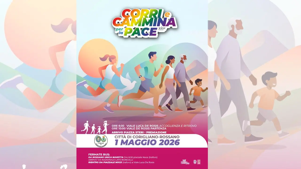 La Città di Corigliano Rossano organizza per il prossimo Primo maggio 2026 la 35° edizione della Corri e Cammina per la Pace, camminata ludico-motoria di circa 7 km da vivere e condividere, che tocca alcuni dei punti più caratteristici del patrimonio artistico e naturalistico della città, con partenza da viale De Rosis. Scopo dell’evento è quello di favorire e incentivare la promozione del benessere psico-fisico attraverso la pratica dell’attività motoria e la condivisione di un momento di unione e aggregazione sociale per tutta la cittadinanza.