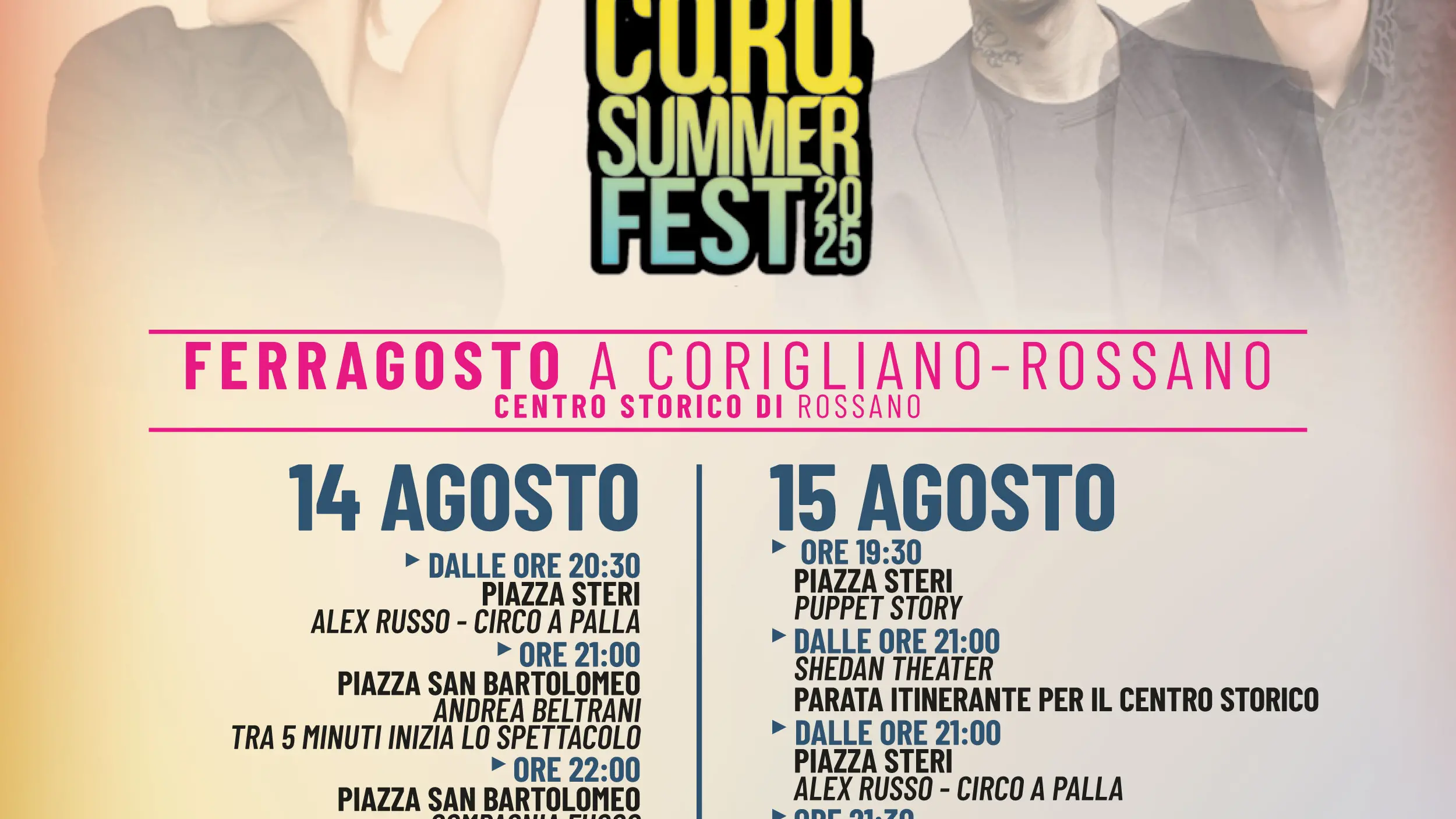 origliano-Rossano si prepara a vivere due giorni di festa per la Madonna Achiropita, patrona della città, in un mix di spiritualità, intrattenimento e grandi nomi della musica italiana. Il 14 e 15 agosto il centro storico di Rossano sarà il cuore pulsante del Co.Ro. Summer Fest 2025, con spettacoli per famiglie, artisti di strada, performance musicali e parate itineranti.