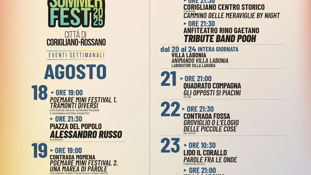 Il CoRo Summer Fest 2025 entra nel vivo con una settimana di appuntamenti che, dal 19 al 24 agosto, animeranno Corigliano Rossano con musica, teatro, spettacoli per famiglie ed eventi culturali. Un cartellone diffuso, che coinvolge non solo i centri balneari, ma anche i centri storici e le periferie, offrendo serate a tema pensate per residenti e turisti.