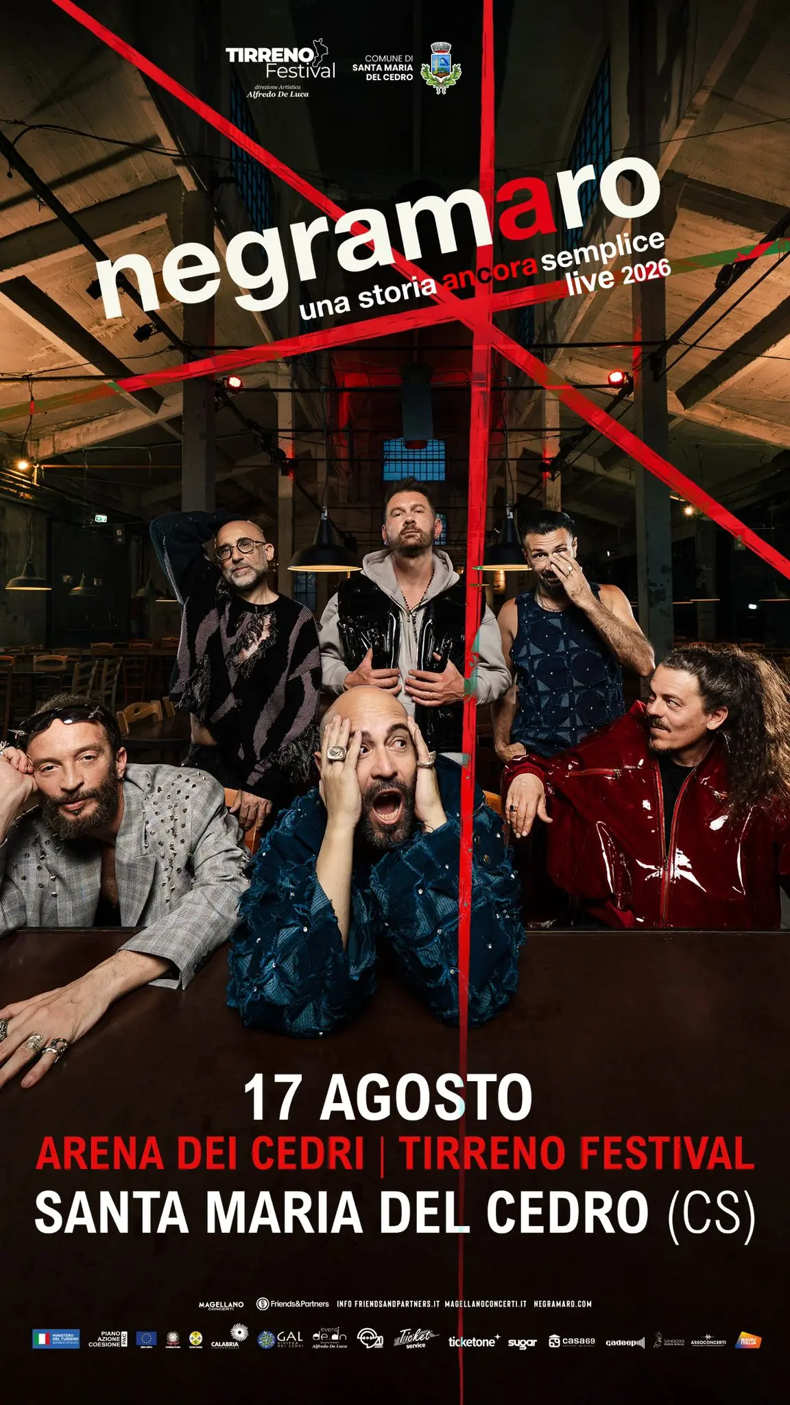 Tra le tappe più attese c’è quella di Santa Maria del Cedro, dove i Negramaro si esibiranno il 17 agosto 2026 all’interno dell’Arena dei Cedri nuova di zecca.