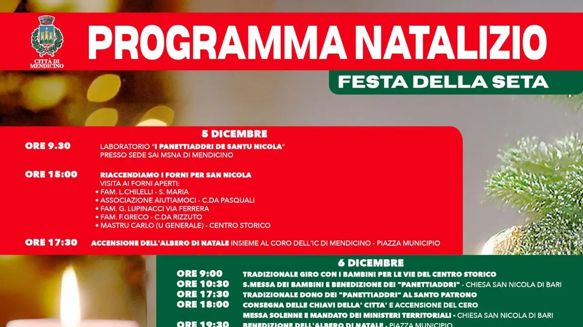 Mendicino si prepara a vivere uno dei momenti più attesi dell’anno con un calendario che abbraccia storia, creatività e partecipazione. Il Comune ha presentato il Programma Natalizio 2025 – Festa della Seta, un percorso diffuso che accompagnerà la comunità dal 5 dicembre fino all’Epifania, trasformando il paese in un mosaico di tradizioni, incontri e atmosfere tipiche del Natale mendicinese.