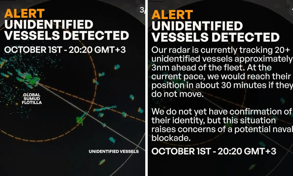 La Flotilla ha segnalato la presenza di oltre venti navi sui radar, a circa tre miglia nautiche dalla propria posizione. Secondo gli organizzatori, potrebbe trattarsi di un blocco navale. In un comunicato, gli attivisti hanno sottolineato: «Non ci faremo intimidire da minacce, disturbi o prove di forza che proteggono l’assedio illegale di Israele a Gaza».