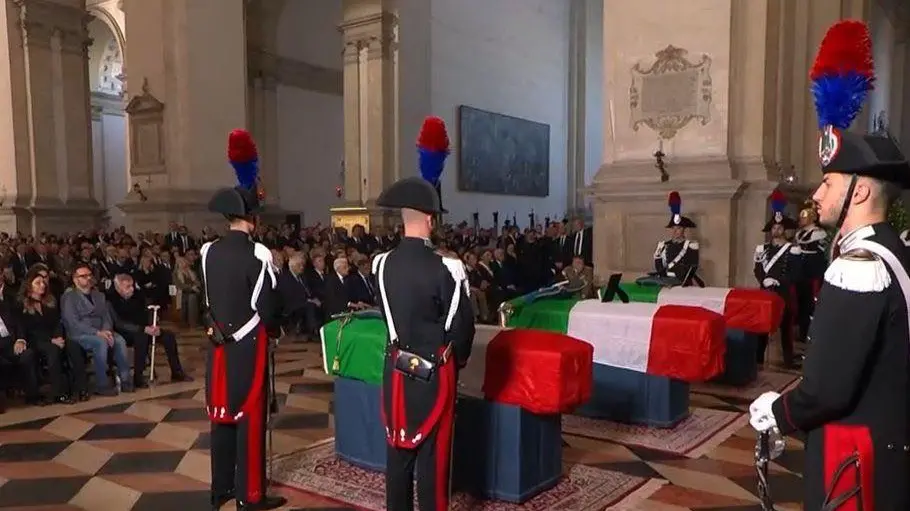 "Ci sono giorni che nessuno di noi vorrebbe vivere. Ci sono parole che nessuno di noi vorrebbe dire, oggi è uno di quei giorni. L'Italia è qua e si raccoglie in un profondo dolore in onore di tre uomini, tre carabinieri, tre soldati, tre servitori dello Stato". Così il ministro della Difesa, Guido Crosetto, si era espresso poco prima durante la celebrazione.