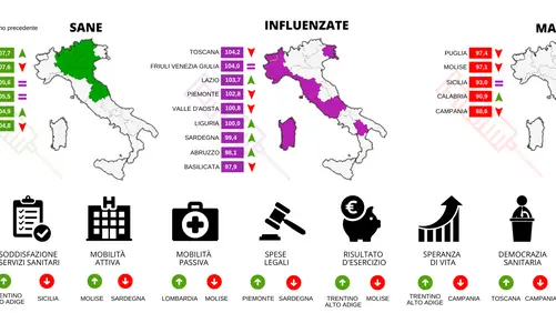 Sei realtà regionali “sane”, nove “influenzate” e cinque “malate”. È l’Emilia-Romagna, la regione in testa per efficienza del sistema sanitario italiano, strappando la prima posizione al Trentino-Alto Adige, mentre Campania, Calabria e Sicilia si collocano in coda tra le realtà “più malate” del paese. Rispetto allo scorso anno, si riduce l’area delle regioni “sane” (da 9 a 5 realtà), e aumenta il raggruppamento dei sistemi sanitari “influenzati” (da 6 a 9 realtà) mentre resta stabile il cluster delle regioni cosiddette “malate”.